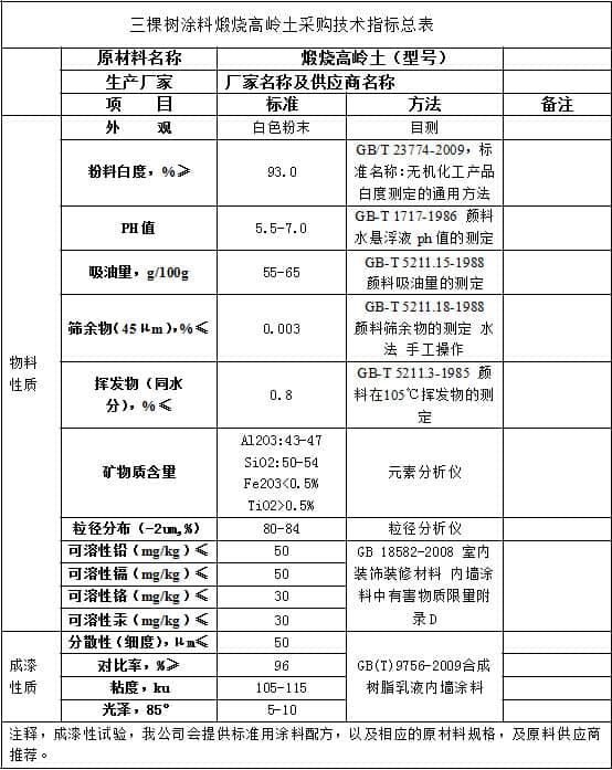 三棵樹(shù)涂料煅燒高嶺土類采購(gòu)技術(shù)指標(biāo)