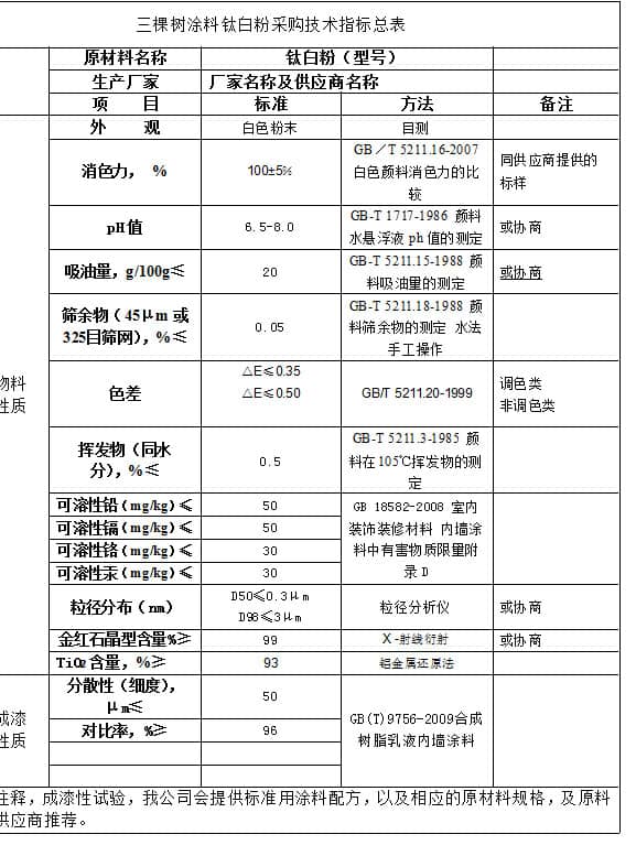 三棵樹涂料鈦白粉類采購技術(shù)指標(biāo)
