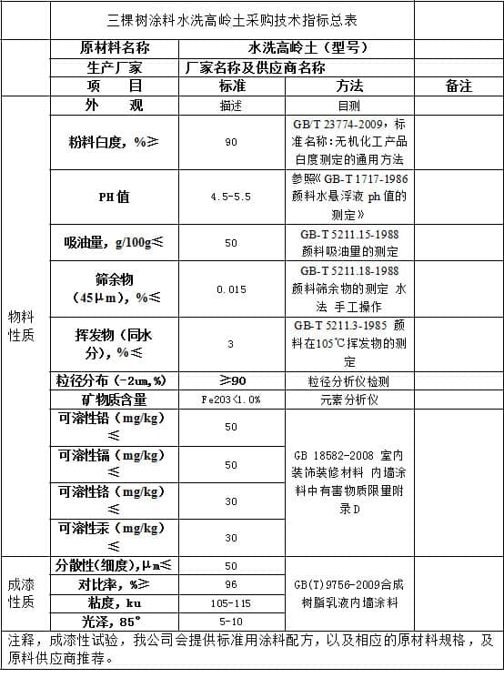 三棵樹涂料水洗高嶺土類采購技術(shù)指標