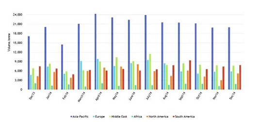圖2、2013年12月-2014年12月中國鈦白粉出口地區(qū)分布情況