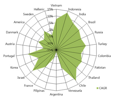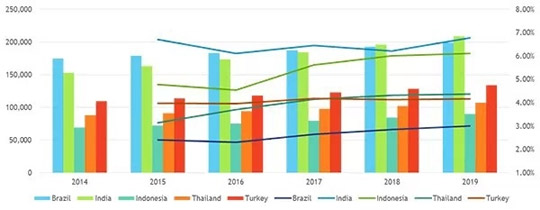 鈦白粉的市場需求變化情況與國家的宏觀經(jīng)濟環(huán)境變化的緊密相關(guān),CCM花費了大量的時間和精力去尋找各國歷年變化的宏觀經(jīng)濟數(shù)據(jù),結(jié)合人均GDP、工業(yè)GDP產(chǎn)值、PMI指數(shù)、PPI指數(shù)、城鎮(zhèn)人口比例等大量數(shù)據(jù),經(jīng)反復篩選后以線性擬合的方式構(gòu)建了適用于發(fā)展中國家的鈦白消費量數(shù)據(jù)預測模型,并通過世界銀行,世界經(jīng)貿(mào)組織等對這些發(fā)展中國家的宏觀經(jīng)濟的預測,CCM成功發(fā)掘出五個未來的新興市場國家,分別是:土耳其,印度,巴西,泰國,印度尼西亞。其中,印度將成為需求增速最快的國家,2014年-2015年的需求數(shù)量將從15萬噸漲至21萬噸,巴西將從17萬噸漲至20萬噸,另外3個國家印度尼西亞,泰國以及土耳其的漲幅在2萬噸左右。