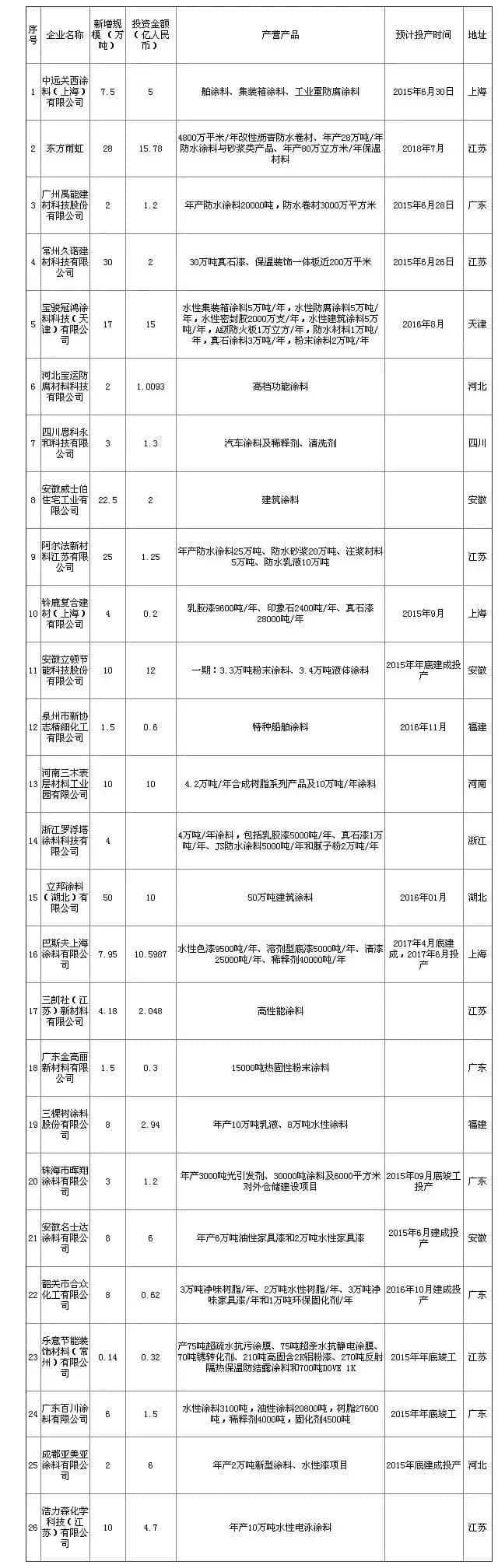 【中國(guó)涂料采購(gòu)網(wǎng)】通過(guò)近三十年的發(fā)展,國(guó)內(nèi)涂料行業(yè)從無(wú)到有,從小到大,直到成為全球最大的涂料生產(chǎn)和消費(fèi)國(guó)。即使國(guó)內(nèi)宏觀經(jīng)濟(jì)進(jìn)入“常態(tài)化”發(fā)展,國(guó)內(nèi)房地產(chǎn)行業(yè)投資逐漸下滑,國(guó)內(nèi)涂料行業(yè)的產(chǎn)量依然保持著5%以上的增長(zhǎng)。下面,我們對(duì)2015年上半年國(guó)內(nèi)涂料行業(yè)新建、擴(kuò)建及投產(chǎn)情況進(jìn)行整理,以饗讀者。