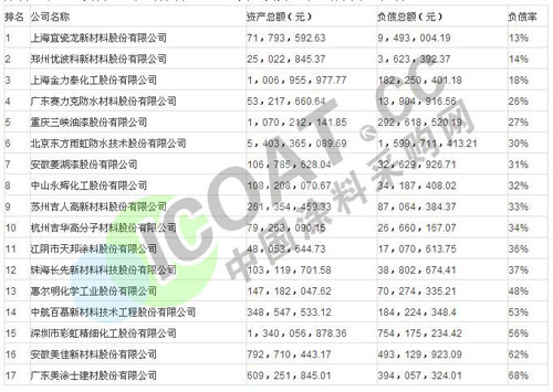 由上表涂料上市企業(yè)公布的總資產(chǎn)與負債資產(chǎn)金額,中國涂料采購網(wǎng)匯總出了各上市企業(yè)的負債率并對其進行了排名。在上表收錄的17家涂料上市企業(yè)及新三板掛牌涂料企業(yè)中,整體看來除了安徽美佳和美涂士之外,其它各涂料企業(yè)的負債經(jīng)營情況都較為合理,安徽美佳的負債率達到62%已經(jīng)越過安全線,而廣東美涂士的資產(chǎn)負債率竟達68%,觸碰“高壓線”亮起資金流轉(zhuǎn)的“紅燈”已不可避免。