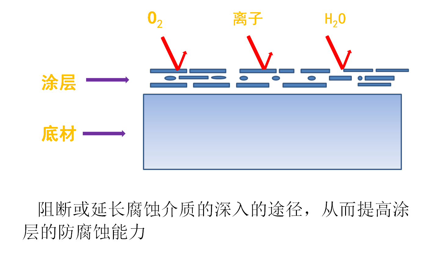 由于在防腐蝕涂料的成膜過程中對底材的潤濕程度、表面張力的均衡、溶劑的殘留以及施工等因素的影響,涂料漆膜都存在一定的透水性和吸水性。這就大大的增加了水、氧氣和離子滲透的幾率,而這些都是造成金屬底材腐蝕的主要原因。所以在涂料中增加片狀顏料能有效的屏蔽水、氧氣和離子等腐蝕因子透過,切斷涂層中的毛細孔。從而阻斷或延長腐蝕介質(zhì)的深入的途徑,從而提高涂層的防腐蝕能力。例如氧化鐵紅、云母粉、鋁粉、云母氧化鐵、玻璃鱗片、不銹鋼鱗片等[3]。
