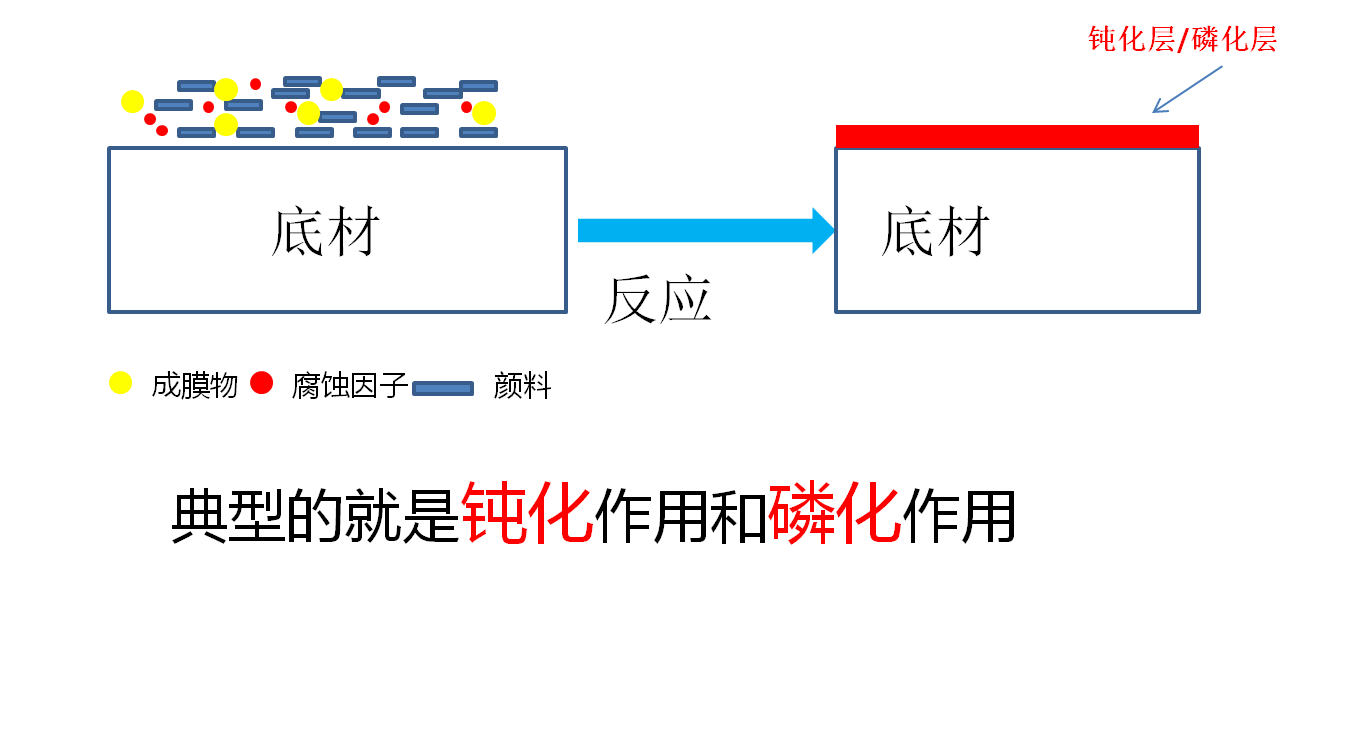 漆膜中某些防銹顏料本身或其與成膜物或水分的反應產(chǎn)物,對金屬底材可以起緩蝕作用,實質(zhì)就是阻緩陽極反應,最典型的就是鈍化作用和磷化作用。傳統(tǒng)的防銹顏料如鉻酸鹽防銹顏料、鉛系防銹顏料、磷酸鹽防銹顏料