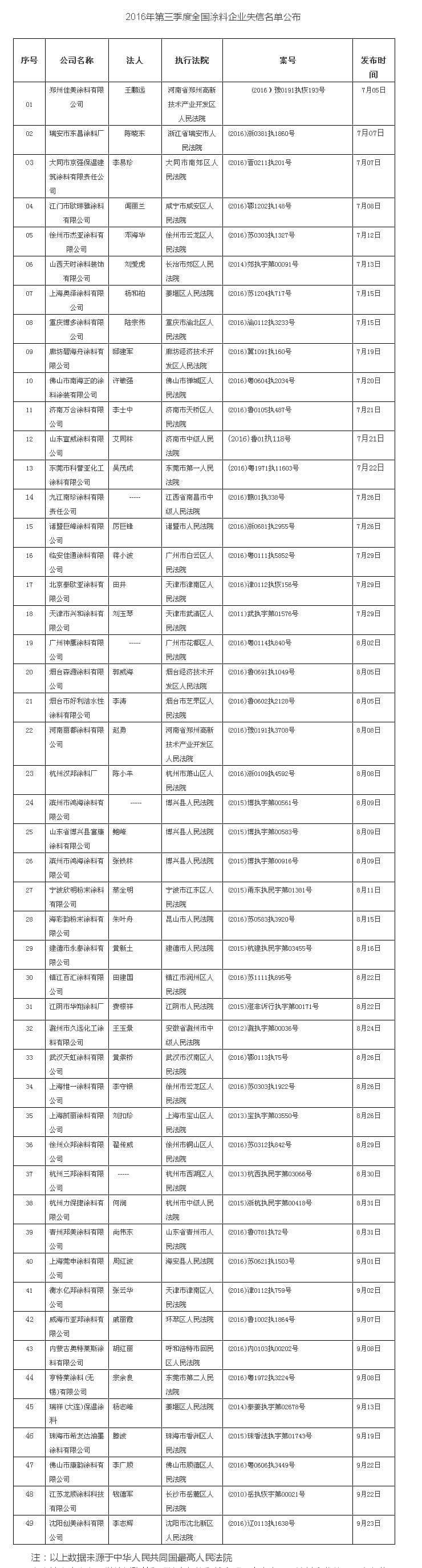 2016年第三季度失信涂料企業(yè)公布 山東宣威等49家上榜