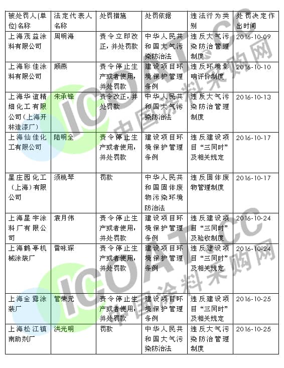 2016年10月份上海市環(huán)保局處罰企業(yè)名單(涂料、原料部分)