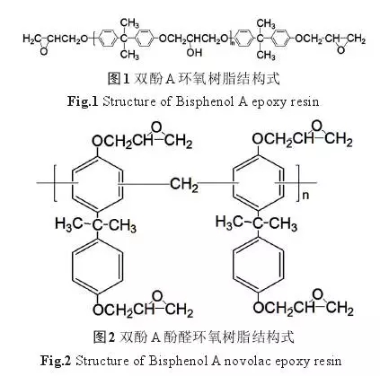 酚醛環(huán)氧樹脂,因含較多的環(huán)氧基團,耐腐蝕性能和粘附力更強;固化交聯(lián)度更大,致密性更強,同時具有酚醛樹脂的耐高溫和耐腐蝕性能。但環(huán)氧基團的增多使脆性增大,影響了其應用范圍。以雙酚A代替苯酚合成雙酚A酚醛環(huán)氧樹脂(如圖2),游離酚含量低,分子量分布窄,雙酚A的引入使樹脂力學性能更強,收縮率更低,環(huán)氧基團的增多使粘附力極強,柔韌性、熱穩(wěn)定性、絕緣性、耐水耐腐蝕性等性能更優(yōu)異。