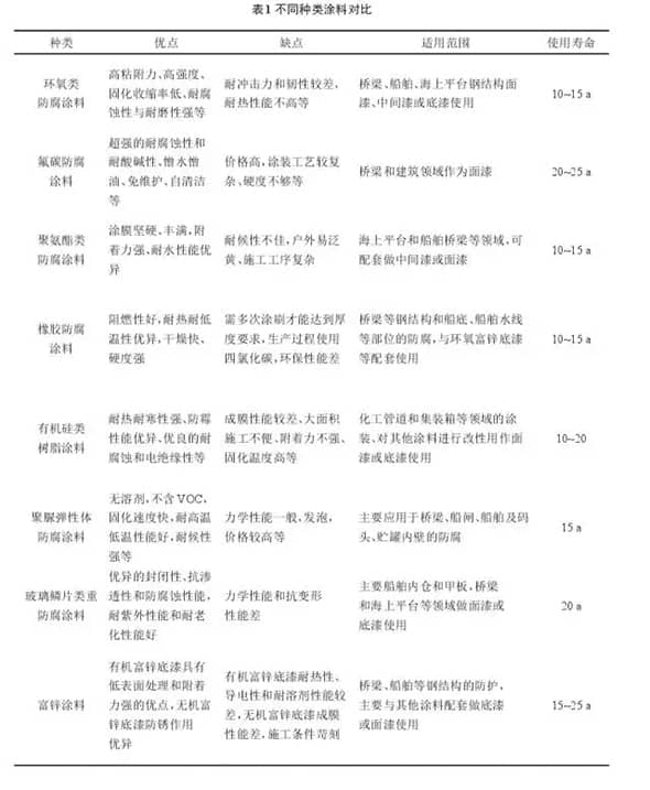 海洋工程中鋼結(jié)構(gòu)的腐蝕種類多樣:電偶腐蝕、空蝕現(xiàn)象、磨損腐蝕和沖擊腐蝕、析氫腐蝕、吸氧腐蝕等。應用較多的重防腐涂料主要有:環(huán)氧類防腐涂料、氟碳防腐涂料、聚氨酯類防腐涂料、橡膠防腐涂料、有機(無機)硅類樹脂涂料、聚脲彈性體防腐涂料、玻璃片類重防腐涂料和有機(無機)富鋅涂料(表1)。
