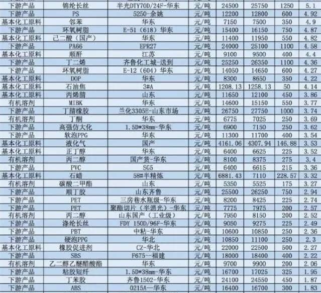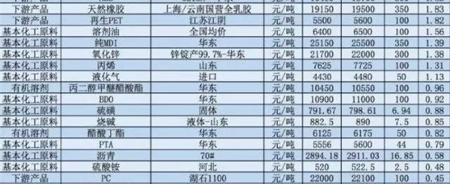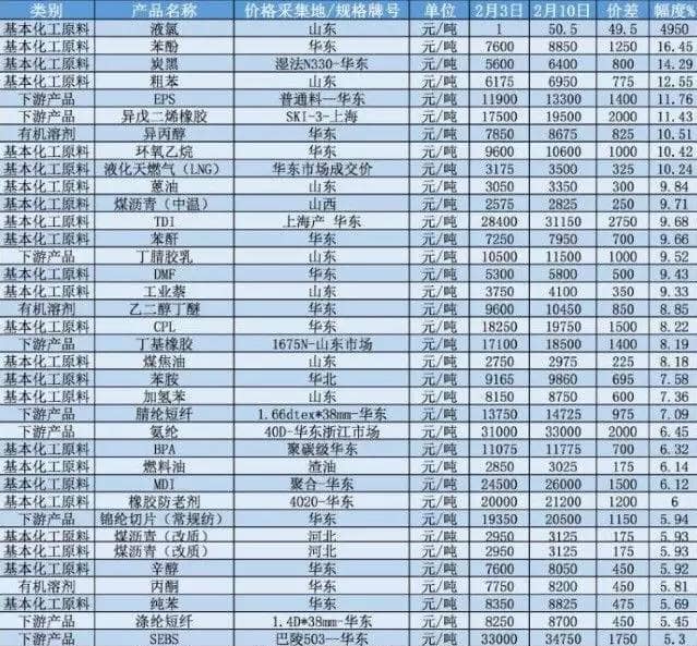 【中國涂料采購網(wǎng)】春節(jié)后歸來,有機化工市場內(nèi)多數(shù)產(chǎn)品在需求逐漸復蘇之下迎來一波漲勢。在24個產(chǎn)品之中,有90個產(chǎn)品上漲,占72.58%,11個產(chǎn)品持穩(wěn),占8.87%,23個產(chǎn)品下降,占18.55%。上漲產(chǎn)品前三名分別是液氯、苯酚、炭黑,漲幅分別4950.00%、16.45%、14.29%,下跌產(chǎn)品前三名分別是天然乳膠、燃料油、焦炭,跌幅分別在7.30%、6.12%、5.11%。