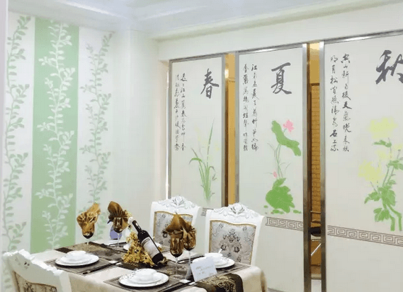 “餐廳背景墻用類(lèi)似草木綠的淺綠作為主色調(diào),紋理用白色、深點(diǎn)的綠,三種色彩層次分明,簡(jiǎn)潔自然。”